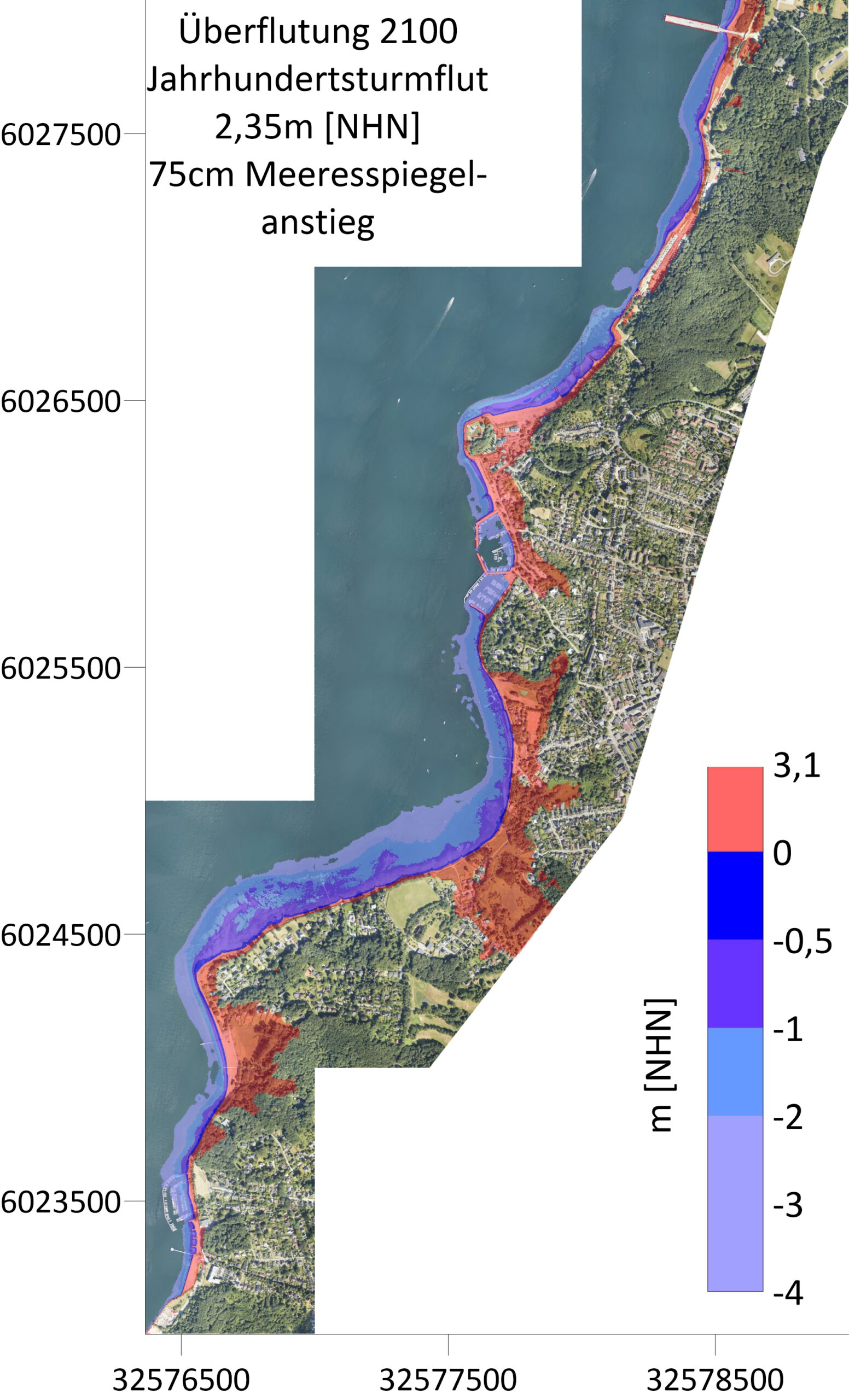 Eine Jahrhundersturmflut mit einem Wasserstand von 2,35m NHN und einem Meerespiegelanstieg von 50cm im Jahre 2075 überflutet jetzt noch weitere Teile des Nordhafens und kleiner Bereiche des Südhafens (siehe folgende Abbildung). Bis Friedrichsort reicht der Wasserstand wiederum bis ans Kliff und überflutet ganz im Süden auch Teile der Dünen und kleinere Bereiche des kleinen Wäldchens.