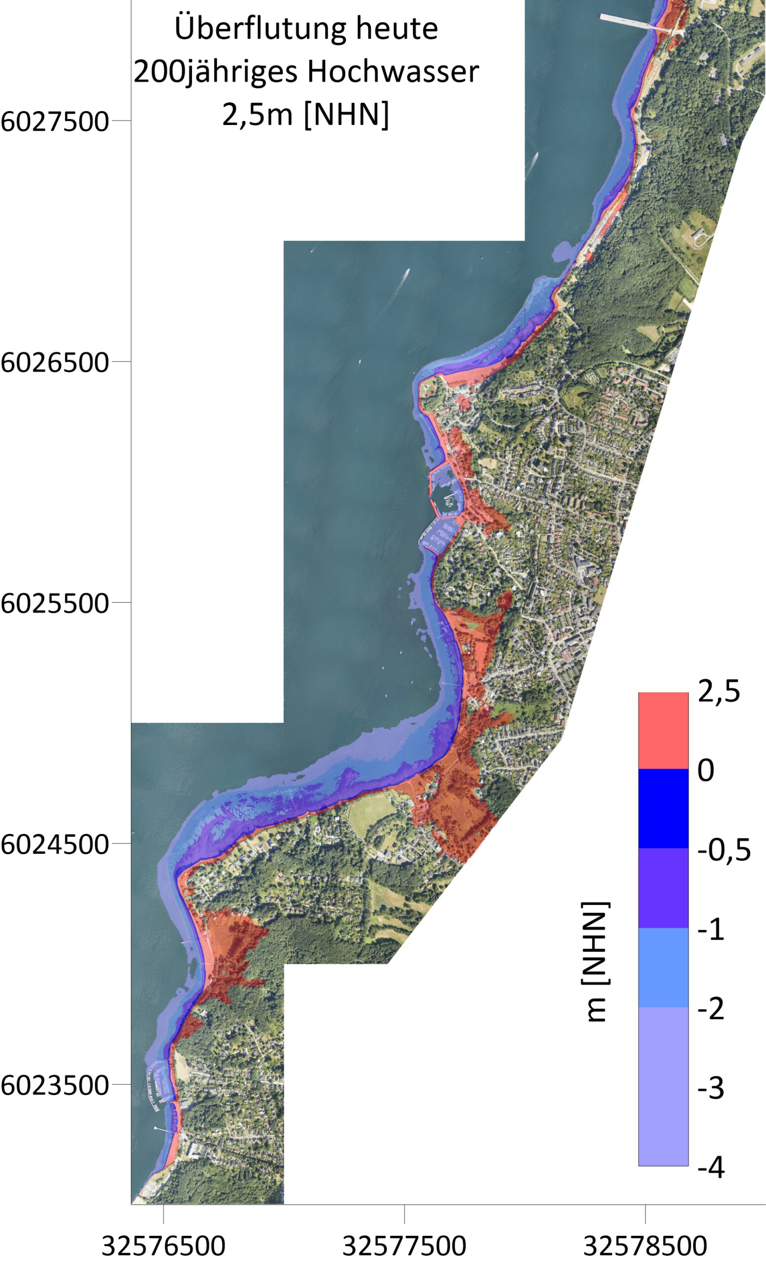 Eine 200jährige Sturmflut mit einem Wasserstand von 2,5m NHN und einem Meeresspiegelanstieg von 50cm im Jahre 2075 führt zu weiterer Überflutung im Nord- und Südhafen (siehe folgende Abbildung). Das südlich vom Hafen gelegene inaktive Kliff wird am Klifffuß leicht überflutet und das daran südlich anschließende aktive Kliff wird von der Ostsee angegriffen. Im Bereich zum Übergang nach Friedrichsort wird der gesamte Strand, der Wanderweg und ein kleiner Bereich des Wäldchen überflutet.