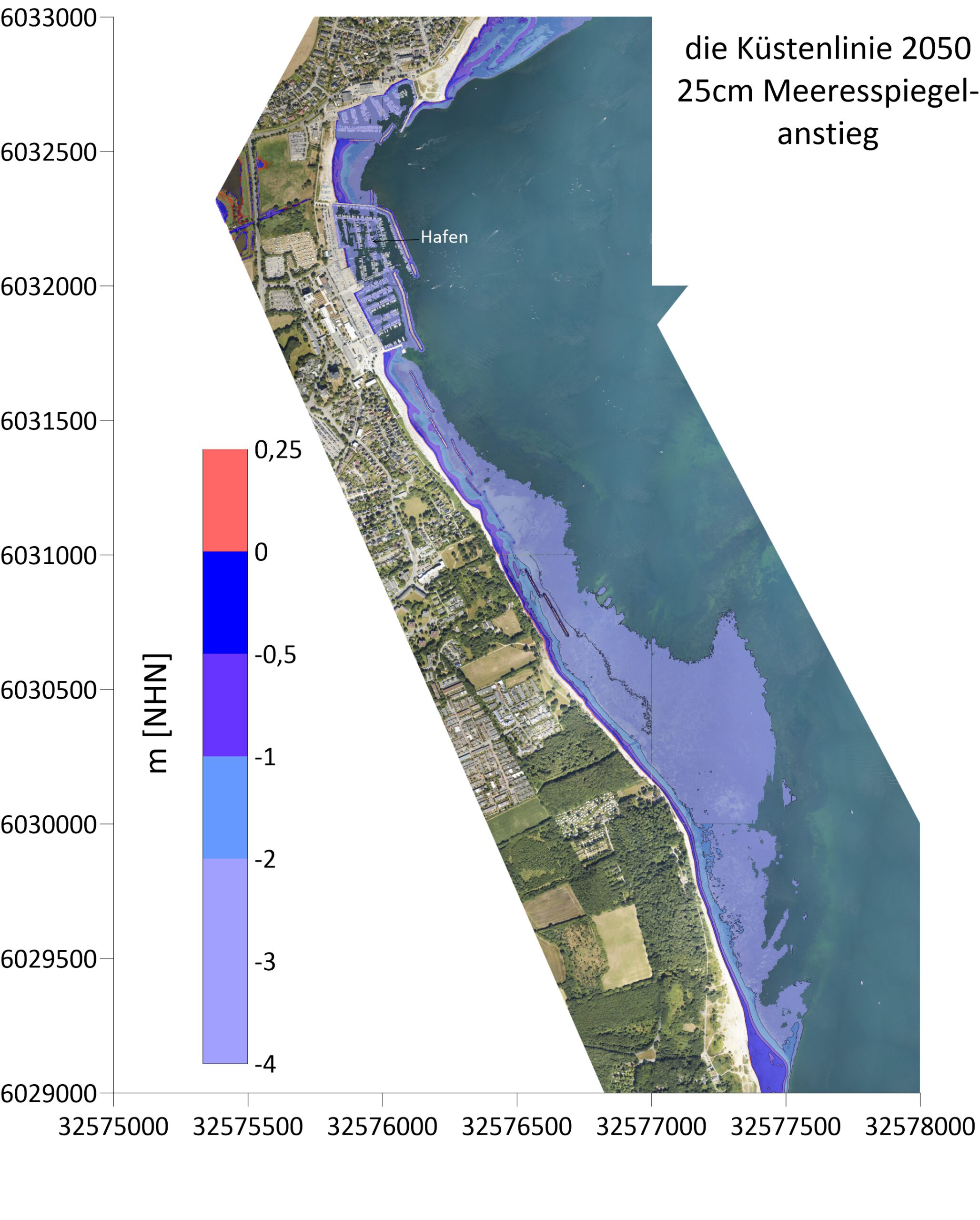 Die Küstenlinie in 25 Jahren, also im Jahre 2050 bei einem Meeresspiegelanstieg von 25cm, ist nur leicht landwärts verschoben (siehe folgende Abbildung). Nur die Sandbank vor dem NER ist teilweise überflutet. Der Leeerosionsbereich mit den Buhnen am Ende des Strandes vor dem U-Boot wird teilweise negativ beeinflußt und es kann zum Kontakt zwischen Meerwasser und Küstenschutzbauwerk kommen. Die Promenade und der Hafenbereich sind nicht betroffen. Südlich des Hafens wir nur ein ganz schmaler Streifen Strand überflutet. Der Standverlust, also die Breite, beträgt in dem Buhenfeld ca. 3.3m. Vom Buhnenfeld bis zum Hafen beträgt der Strandverlust ca. 2,2m.
