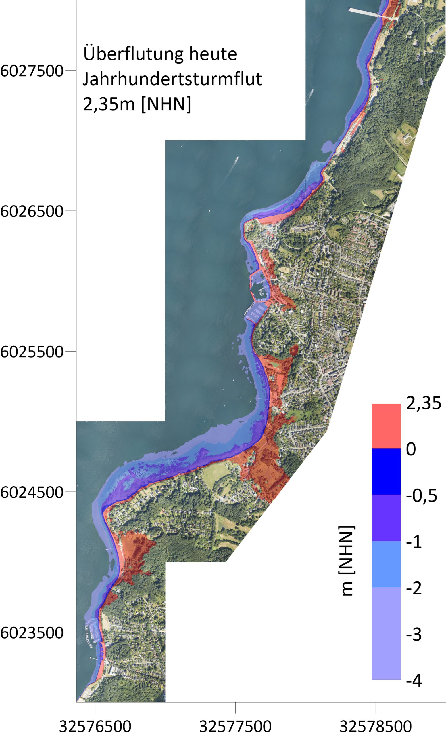 Eine Jahrhundertsturmflut mit einem Wasserstand von 2,35m NHN überflutet teilweise den gesamten Strand vor dem Wanderweg nach Strande (siehe folgende Abbildung). Auch wird ein Bereich im Nordhafen überflutet ebenso wie Teile der Aussenmole. Südlich des Hafens reicht der Wassesstand bis ans Deckwerk und bis ans Kliff. Dies setzt sich bis Falkenstein fort.